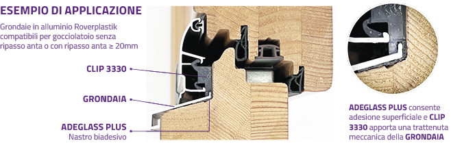 Grazie all’adesivo Adeglass Plus pre-applicato alla base di alluminio della grondaia, il fissaggio al traverso inferiore del telaio risulta essere così molto più rapido, perché evita l’utilizzo di viti di ancoraggio con l’ulteriore vantaggio di non rovinare l’infisso.