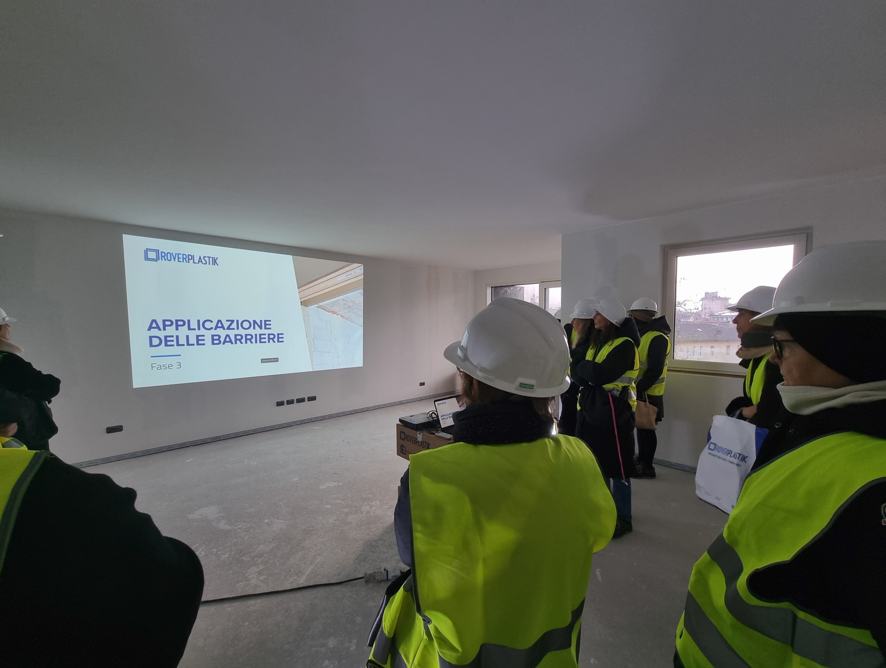 È stata una grande occasione per mostrare alla stampa le molteplici soluzioni per il foro finestra di Roverplastik in fase di posa. Guidati dal Capo cantiere Maurilio Cantafio e da Aldo Guardini, Direttore Generale di Roverplastik i nostri ospiti hanno potuto vedere il monoblocco RoverBlok con VMC applicato con schiuma Roverflex oltre alle barriere per la sigillatura del nodo primario e ai sistemi oscuranti.