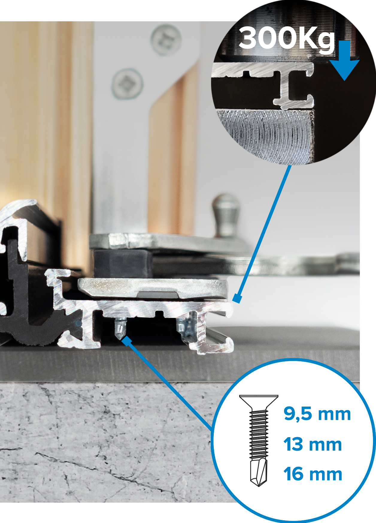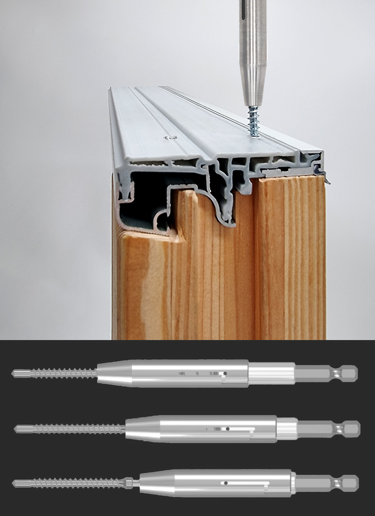 Il nuovo set di viti auto-foranti studiato ad hoc per questo sistema, permettono di fissare ferramenta a scomparsa e riscontri senza pre-foro rimanendo nello spessore della soglia.
