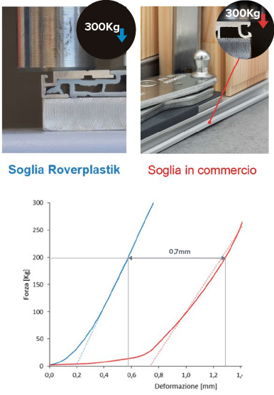 Le prove effettuate dimostrano che le soglie Roverplastik, sotto carico, presentano una rigidezza di circa il 25% in più rispetto alle soglie in commercio.